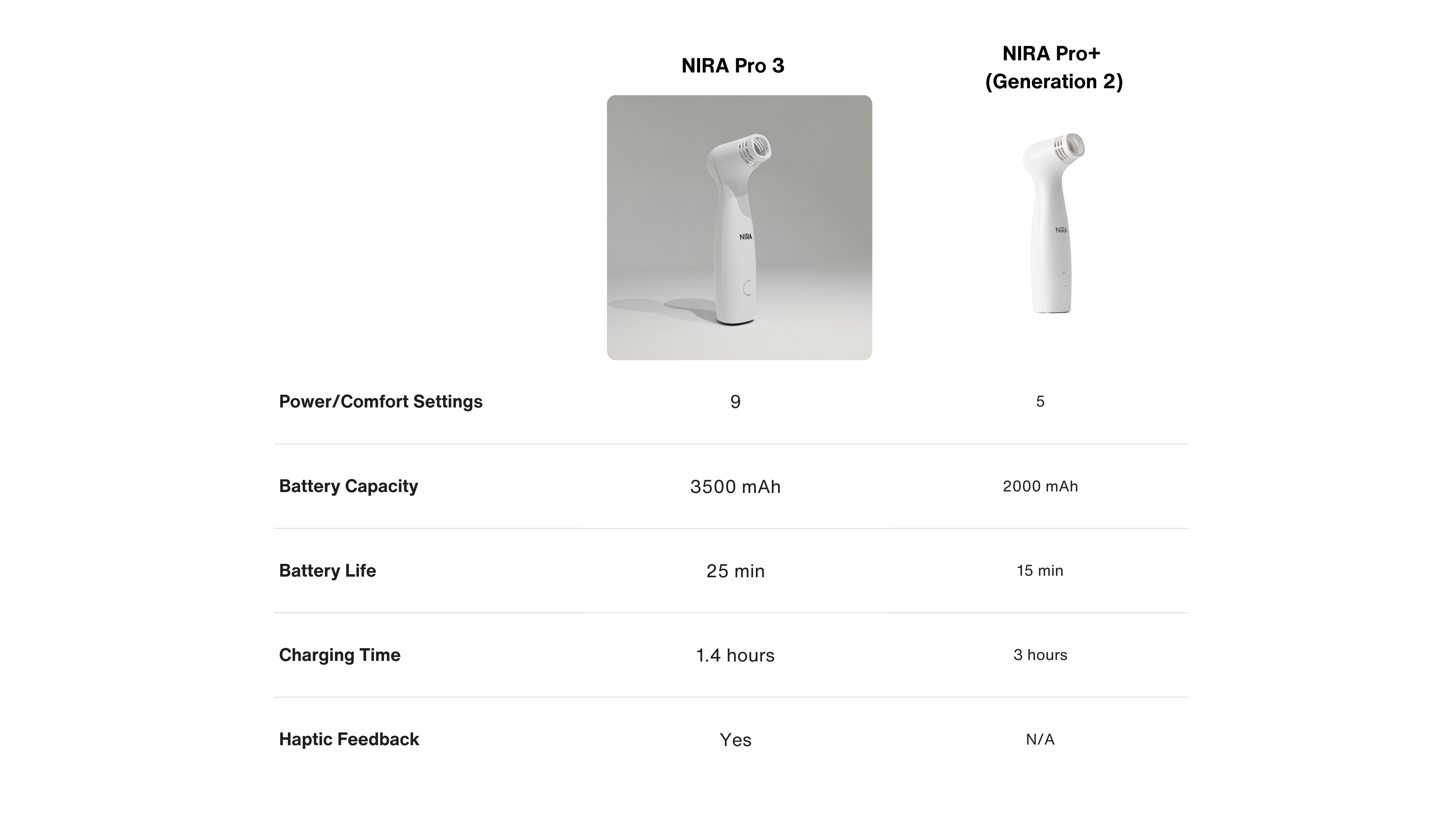 NIRA Pro 3: larger-area coverage + upgraded performance: Designed for treating larger areas on the face and body more efficiently. Pro 3 also adds Silent Mode with haptic feedback, 9 power settings for more precise comfort control, a 75% higher-capacity battery (up to 25 minutes per charge), and 53% faster charging, so it’s ready when you are.